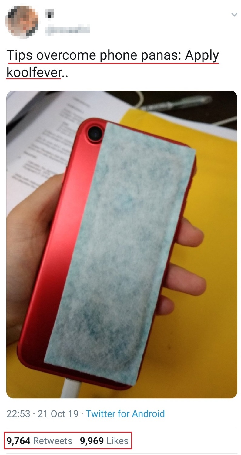 没想到的事,这位来自Twitter的网友上传一张「Kool Fever贴在手机背面上」的照片!还在帖文上写道:「让手机退热的贴士就是使用Kool Fever」!