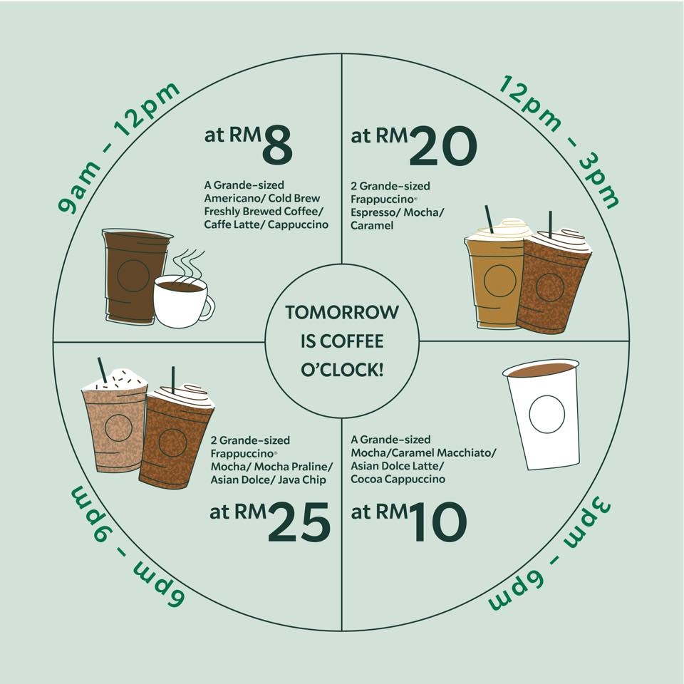 3pm 至 6pm:1 杯Grande-sized(Mocha / Caramel Macchiato / Asian Doice Latte / Cocoa Cappuccino)只需 RM10 !