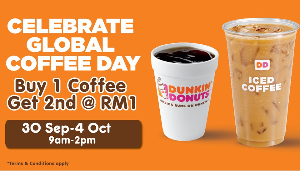 促销活动:Dunkin’ Donuts 国际咖啡日优惠 – 第2杯咖啡只需 RM1 !