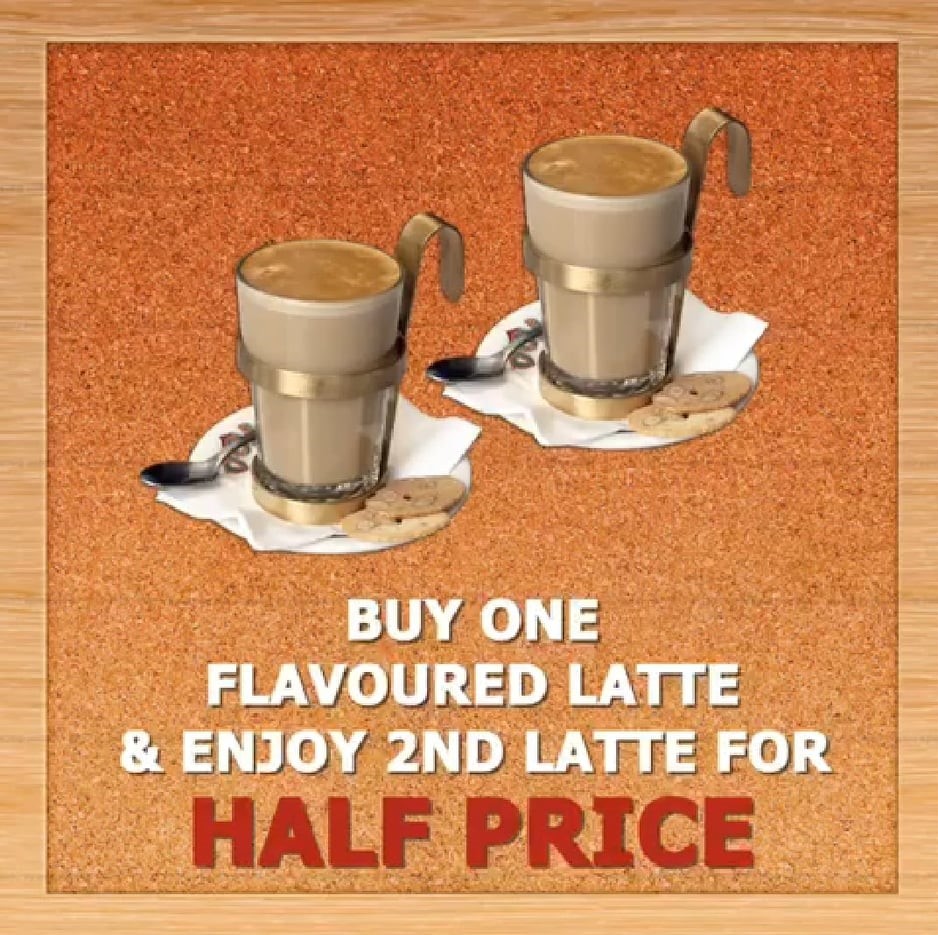 - 以原价购买1杯 Latte,第2杯只需半价!