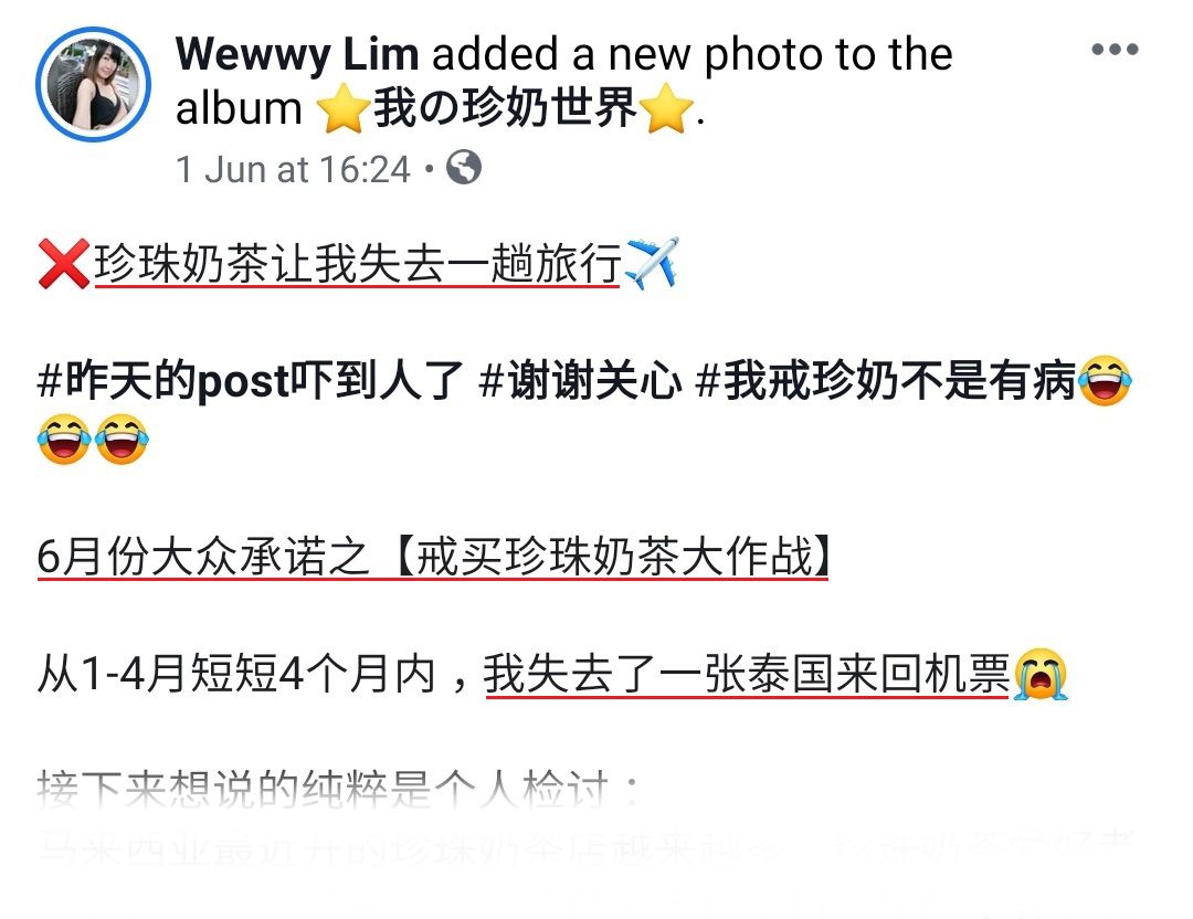 早前,大马一名网友 Wewwy 在面子书分享,热爱奶茶的她因为奶茶而丢失了一趟国外之旅。