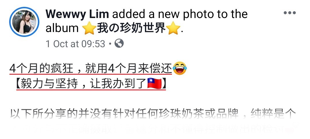 👩🏼:❌疯狂的4个月或更早前,我都觉得不喝珍奶是件奇怪的事,痛苦得要我命,明明工作到很累回到家,突然想到想喝就不顾一切开车去买。
