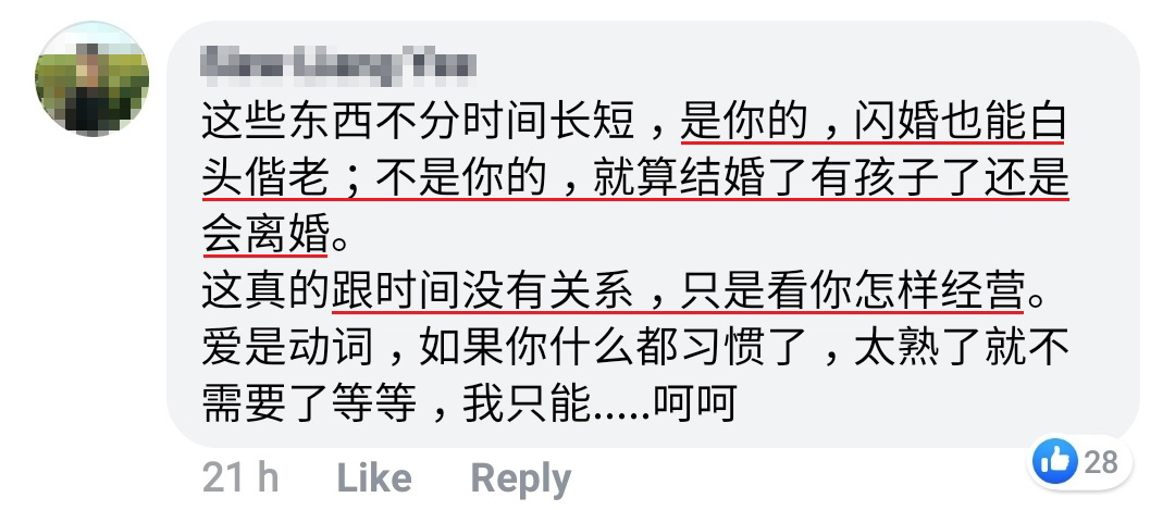 但是主要我想给点个人意见,如果你谈恋爱,最好在1-3年(最多4-5年)内结婚。我们华人还是比较传统的,结婚后就算有什么问题还是吵架等等,都不会轻易离婚。而且结婚后,不管有什么事情,你们会一起面对。快点结婚,等于快点对你“判刑”。所以如果你很满意你的伴侣,其实是没多大问题。时间越久,变数就会多,夜长梦多的意思。错过就没有了,这就是有缘无分。