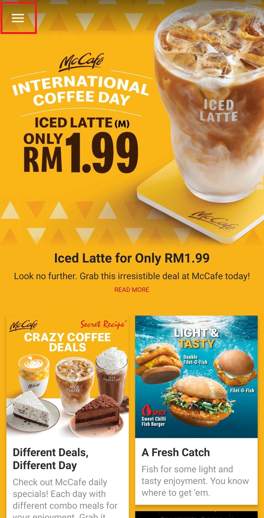 ▼ Step 1:打开手机里的麦当劳APP,点击左上角的“Menu”。