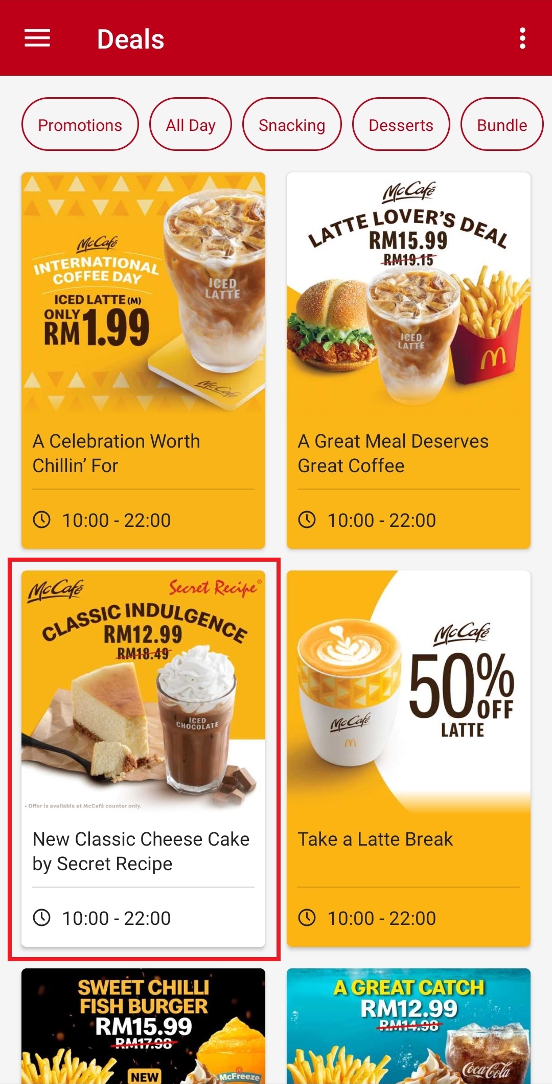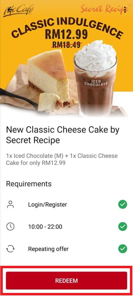 值得注意的是:麦当劳还为 Secret Recipe 蛋糕推出最新优惠,1杯冰巧克力和1块 Secret Recipe 芝士蛋糕,现在只需RM12.99!折扣将近30%!