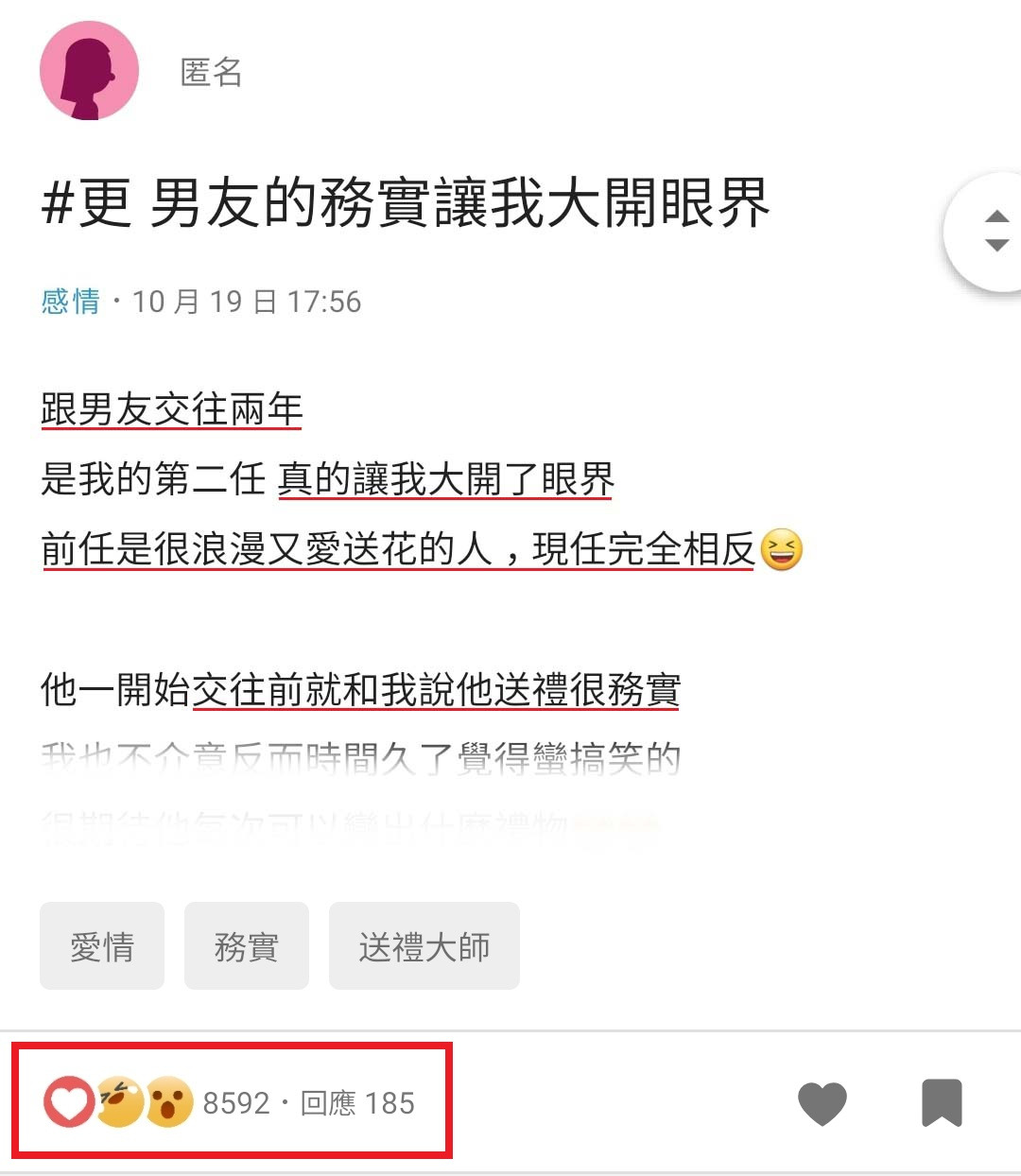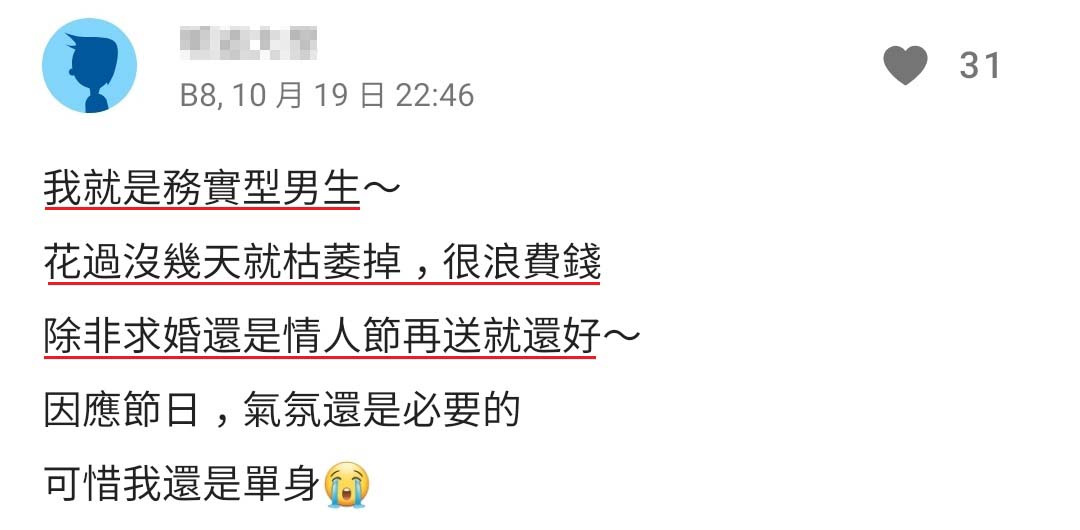 跟男友交往两年。是我的第二任,真的让我大开了眼界。前任是很浪漫又爱送花的人,现任完全相反😆