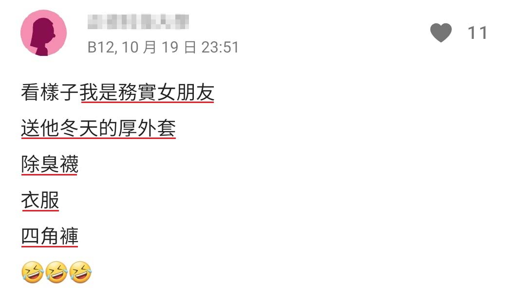 冬天我比较怕冷,尤其我学校又在山上偏远地区,很溼冷。某次他就叫我去领货。居然是发热衣⋯恩好,好像还蛮贴心!
