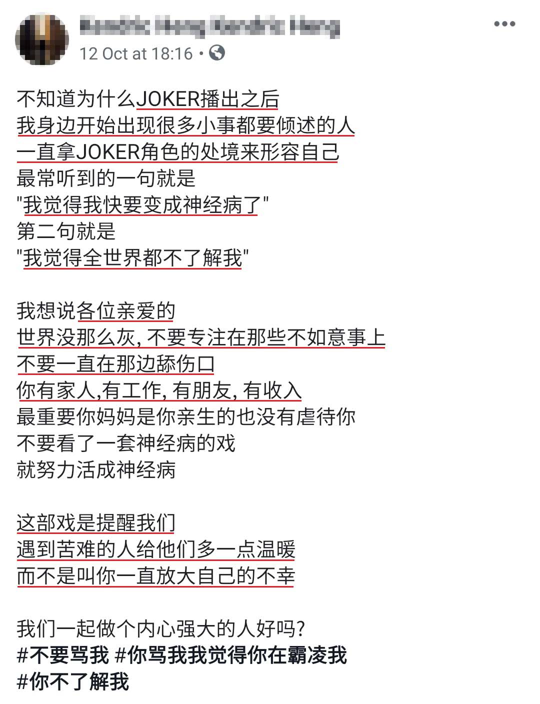 原PO在帖文里写道,近期身边很多人都去了《小丑》这部电影,但他们看完以后,竟然都出现类似同样的状况,就是形容自己的处境就和《小丑》一样!
