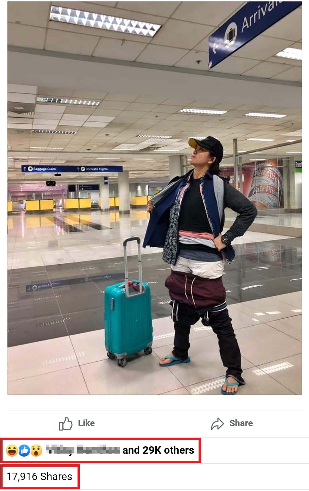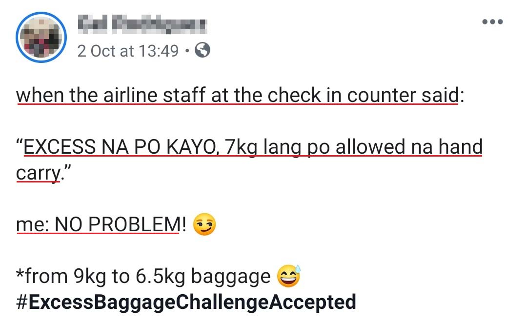 日前,一名来自菲律宾的女子通过面子书PO文,分享自己的“才艺”!她被告知手提行李已超重,于是她当场做了一个“大举动”,成功挽救局面!