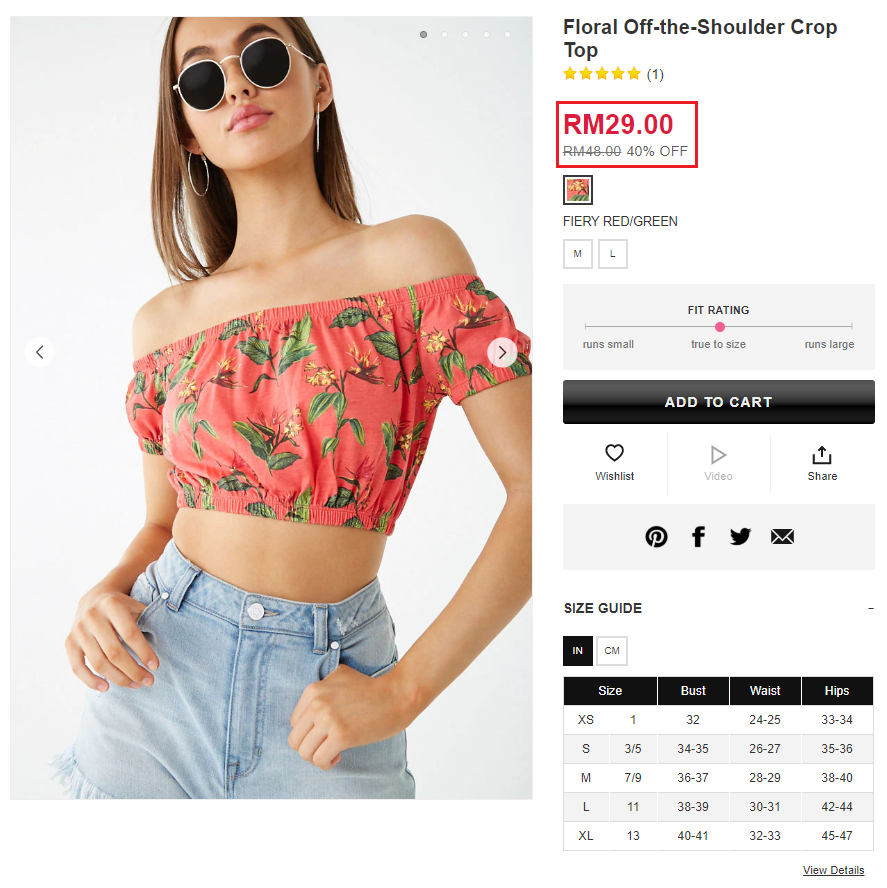 ▼ Floral Off-the-Shoulder Crop Top 折扣40%后只需RM29(原价RM48)