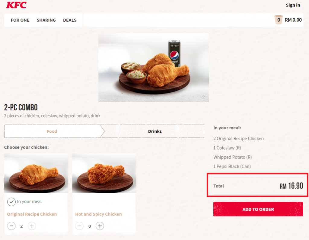 - 2块炸鸡(原味/香辣)+薯泥 + Coleslaw + 1杯 PEPSI
