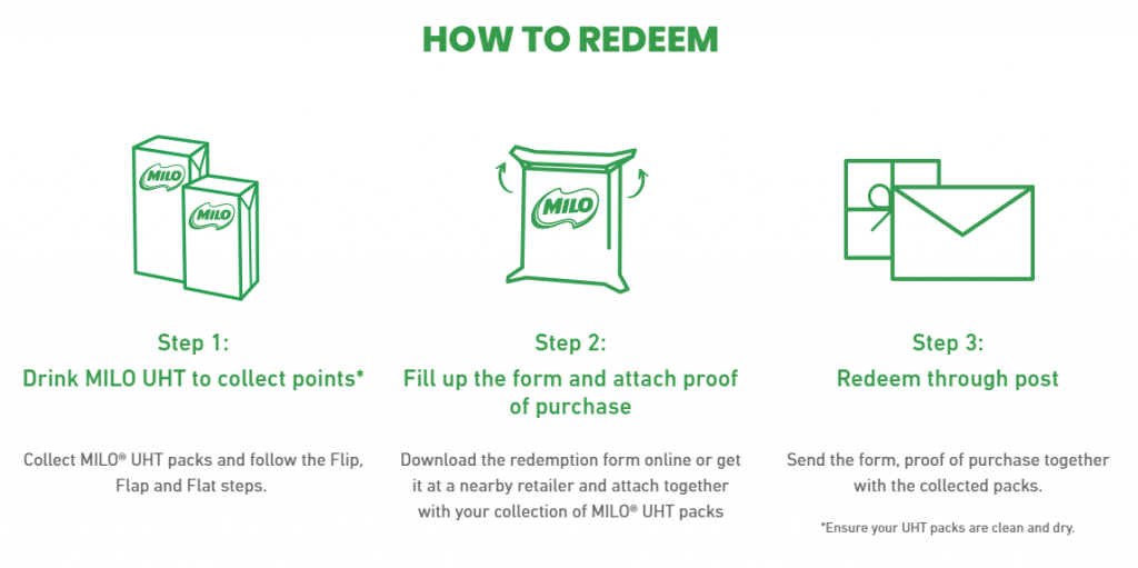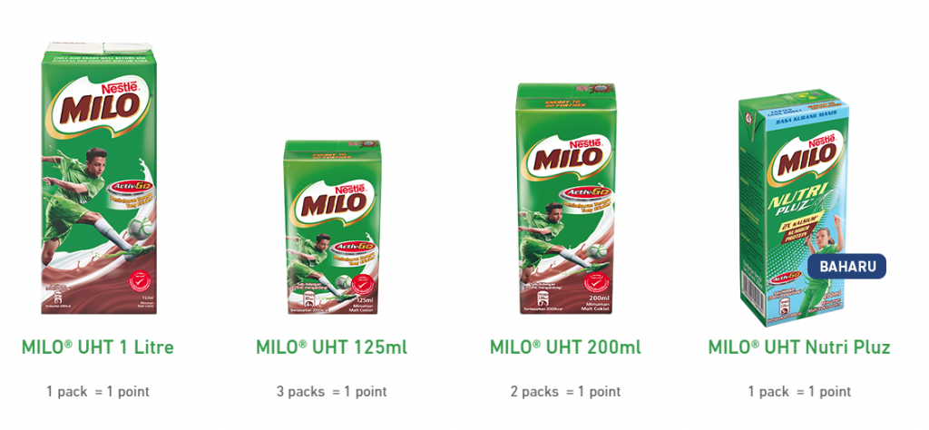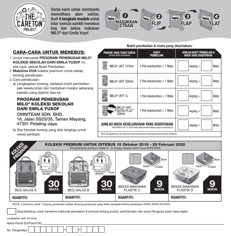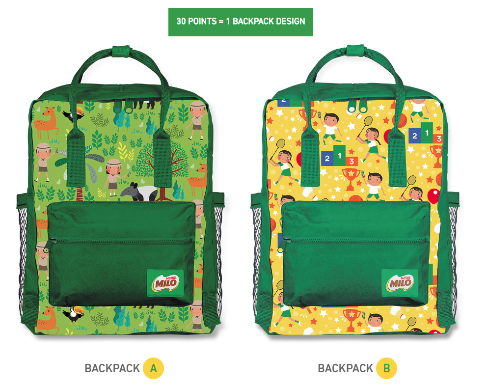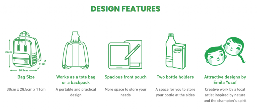 只要从即日起购买指定Milo 即饮饮料,并收集收据,就能兑换书包!最低9个积分就能兑换一个便当盒!
