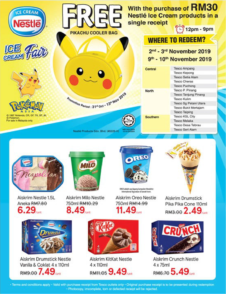 那如何获得这项优惠呢?!你只需要到大马Tesco购买RM30或以上的Nestle冰淇淋便可免费获得Pikachu保温袋啦!
