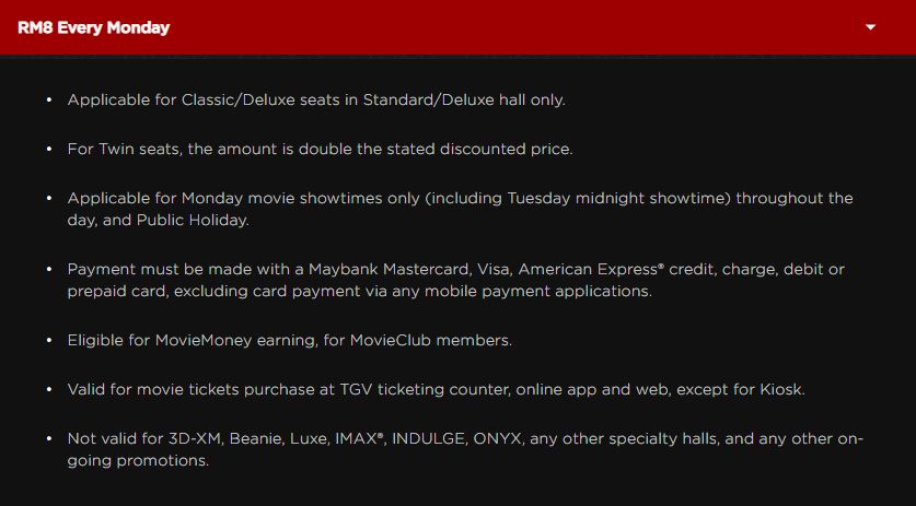 - 只限星期一电影播映时间(包括星期二凌晨播映时间)全天及公共假期