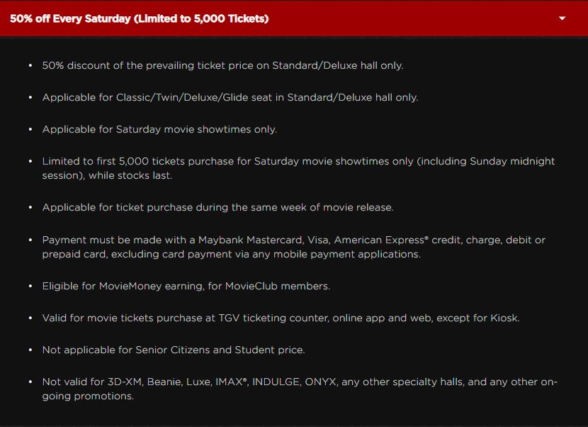 2)每逢星期六Standard和Deluxe Hall的电影戏票50%折扣
