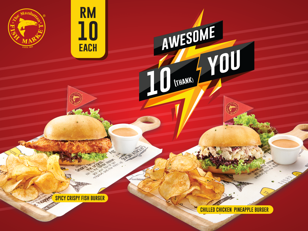 今日是双10节!各大饮食界商家纷纷推出双10优惠餐!The Manhattan Fish Market也不例外~配合双10节即日起推出「“Thanks” you」汉堡大促销!一份汉堡只需RM10!