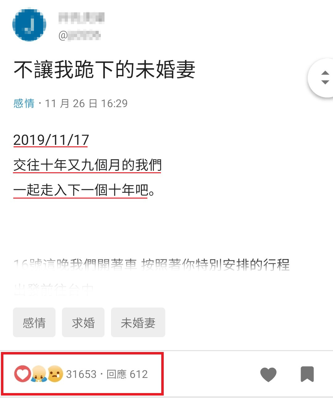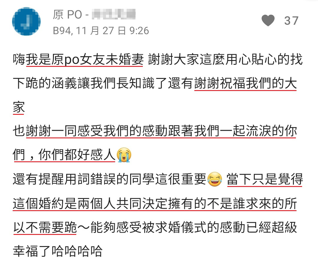 ▼ 原PO的未婚妻,留言感谢大家的祝福,并解释「当时不让男友跪下」的原因。