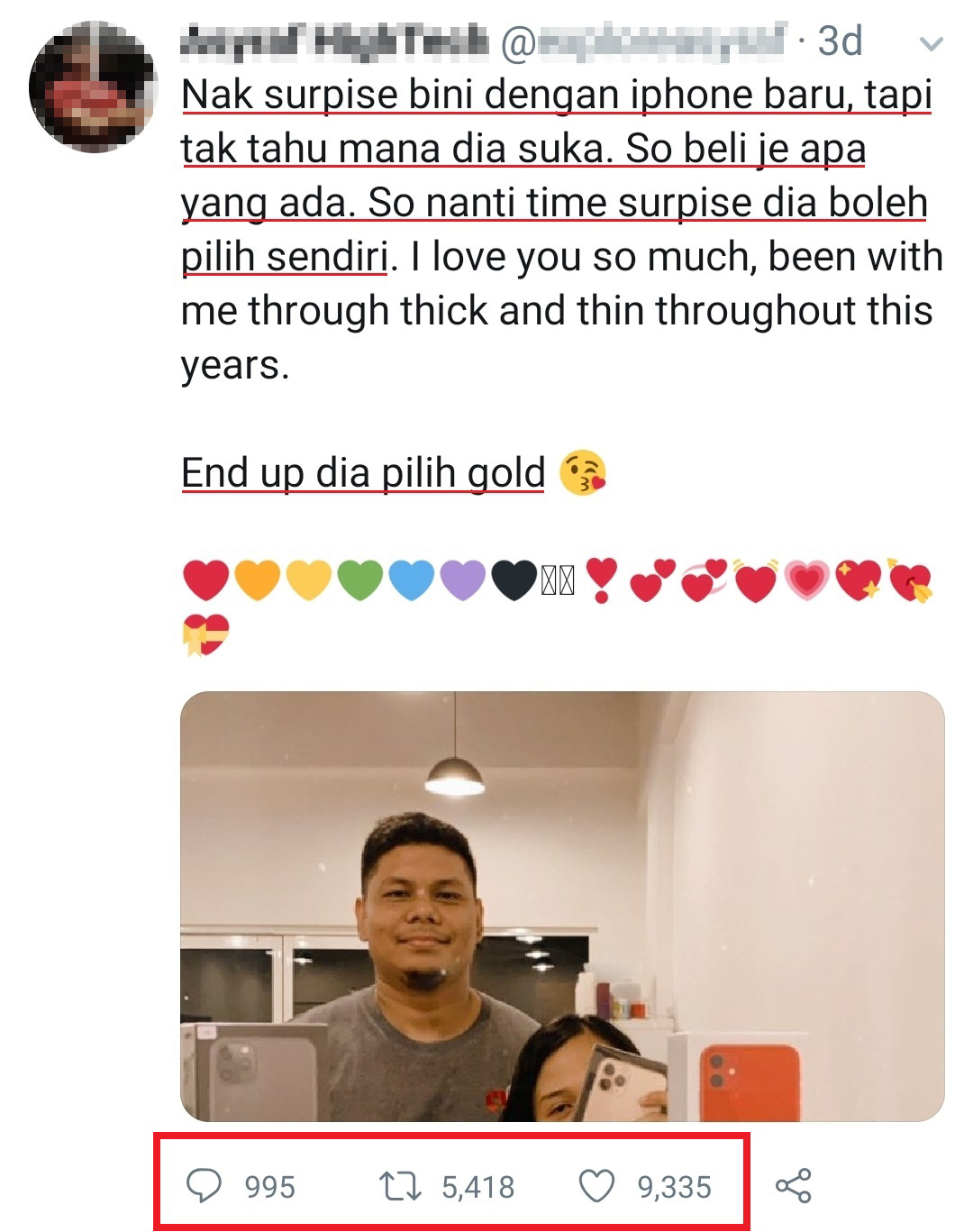 近日,一名大马男子在 Twitter 分享帖文,想要送妻子一台全新的 iPhone 作为惊喜,但不知道妻子喜欢什么颜色,于是他这么做!