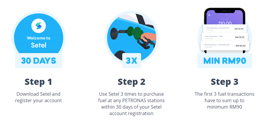 - 新用户必须在Setel帐户注册30天内使用Setel 3次购买燃料才能获得10%现金回扣。