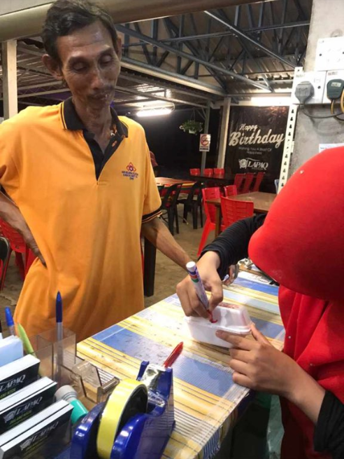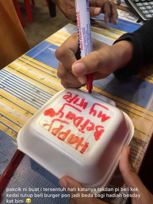 当时,这名网友的同学在这家西餐店打工,刚好碰到这一位Pak Cik要打包汉堡!但令人惊讶的就是这名Pak Cik竟然要求在汉堡的盒子写上“Happy Birthday My Wife”!