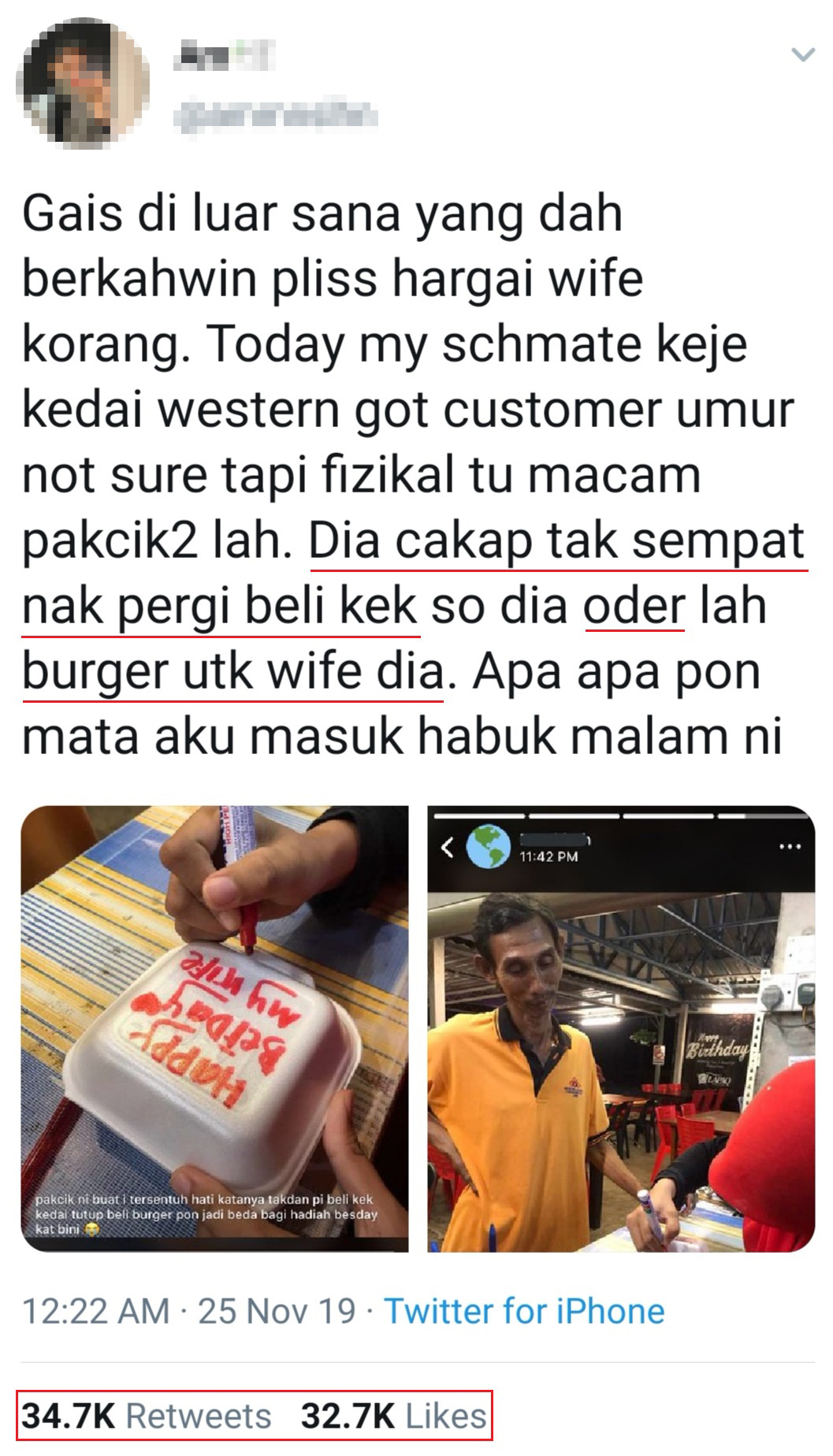 一名网友在Twitter中发出帖文写道「已婚的男子请好好珍惜自己的妻子」!还分享出“Pak Cik”如何在妻子的生日当天做出令人掉泪的感人举动!