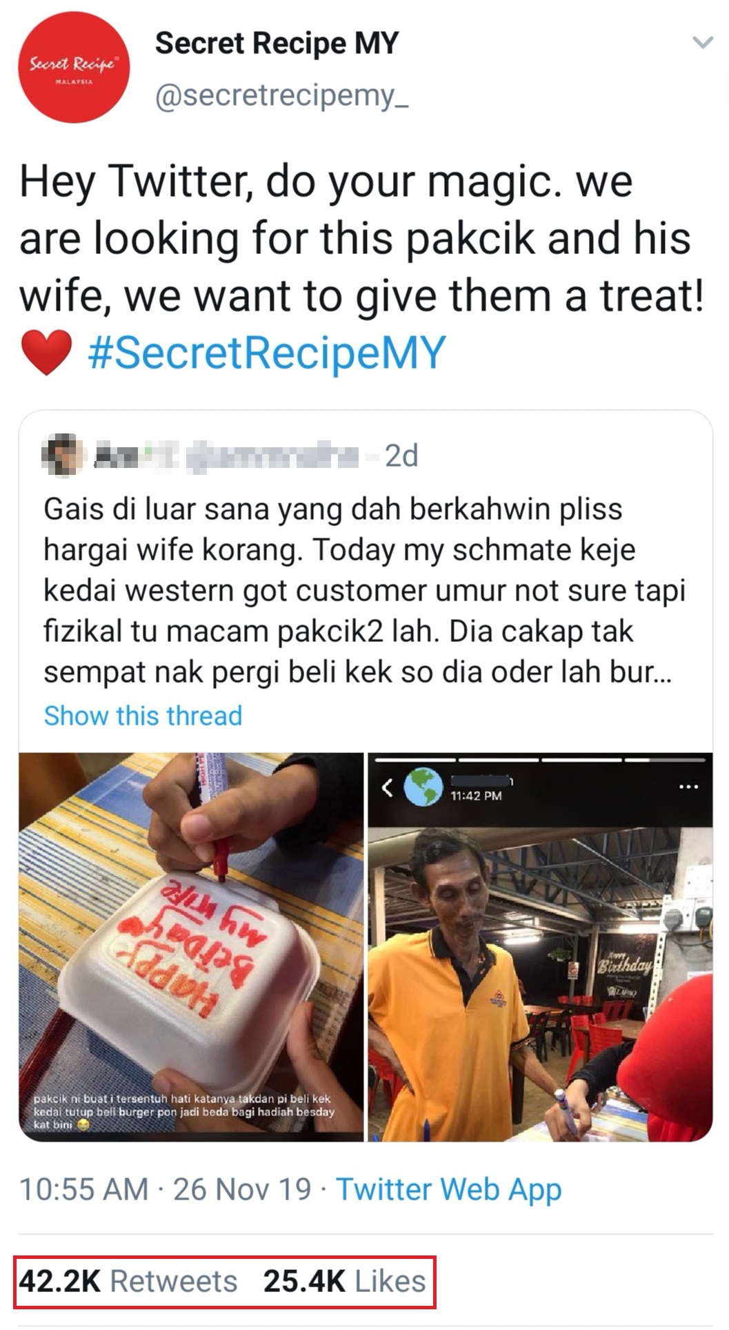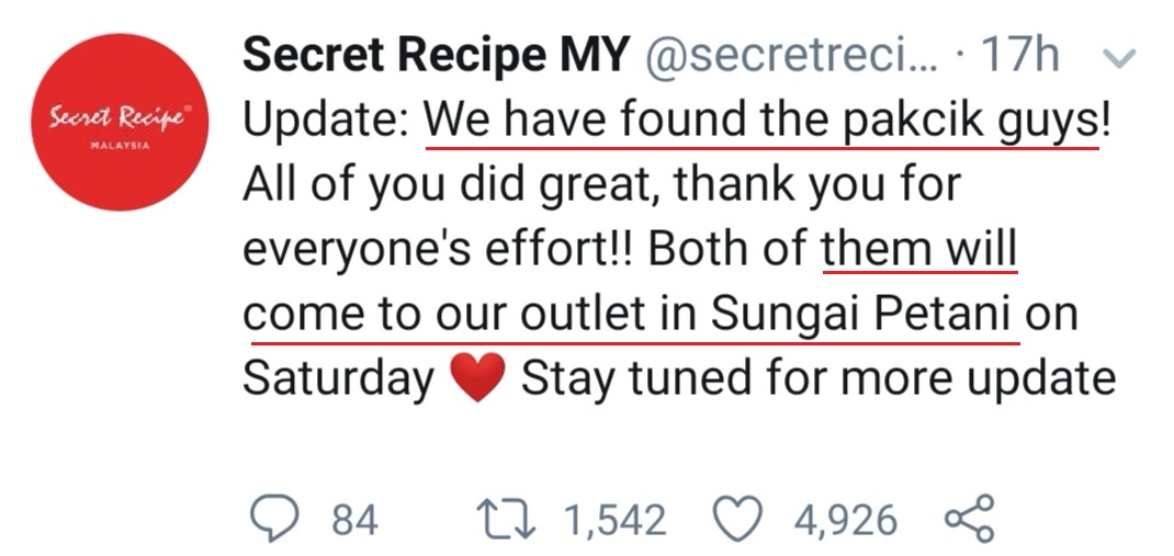 就在短短几个小时后,Secret Recipe在Twitter上发表“网友们找到这对老夫妇了”!还指出会请他们在这个来临的星期六前往Sungai Petani的Secret Recipe分行享用免费的蛋糕!