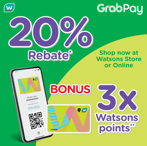 现在只要在 Watsons 店内或官网购物,并使用 GrabPay 付款,可获20%的现金回扣哦!