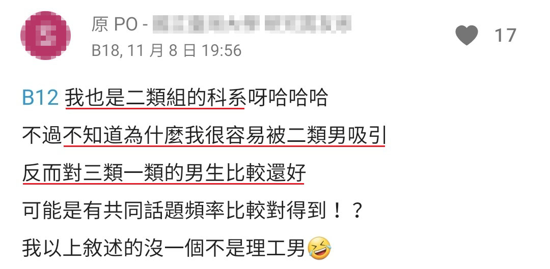 ▼ 网友问原PO为什么只喜欢这个科系的男生,而原PO也有回应哦!