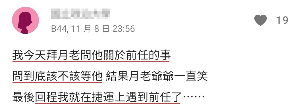 结果我站在月老面前又想说真的这么准!?心里想说:嗯… 之前都是电资男,那下次可不可以也是理工男但不要电资男?