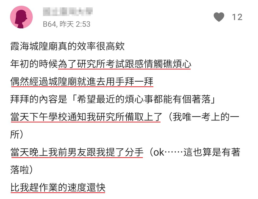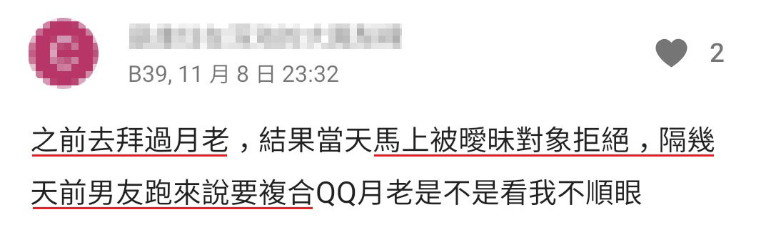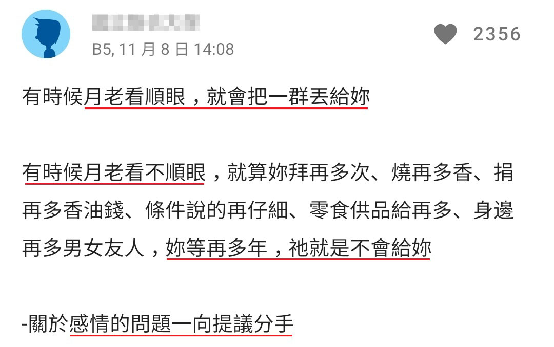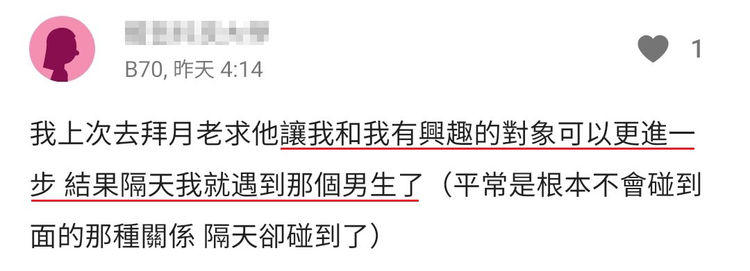 无论是男生或女生,不少人为了姻缘都会去拜月老。近日一名台湾网友PO文分享自己的经验,多次求月老,竟然每次都中!而且是下午拜完,晚上就被告白了!