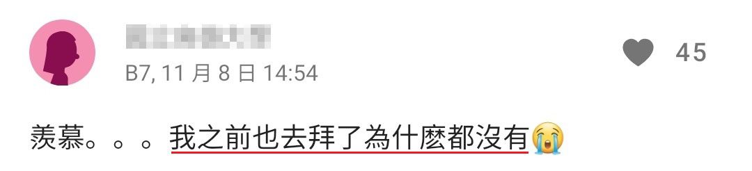 什么东西都没带、也没拿香拜,就单纯用手拜。我记得我当初在那随便开条件:要理工科、离我越远越好的学校、身高170cm到180cm之间。