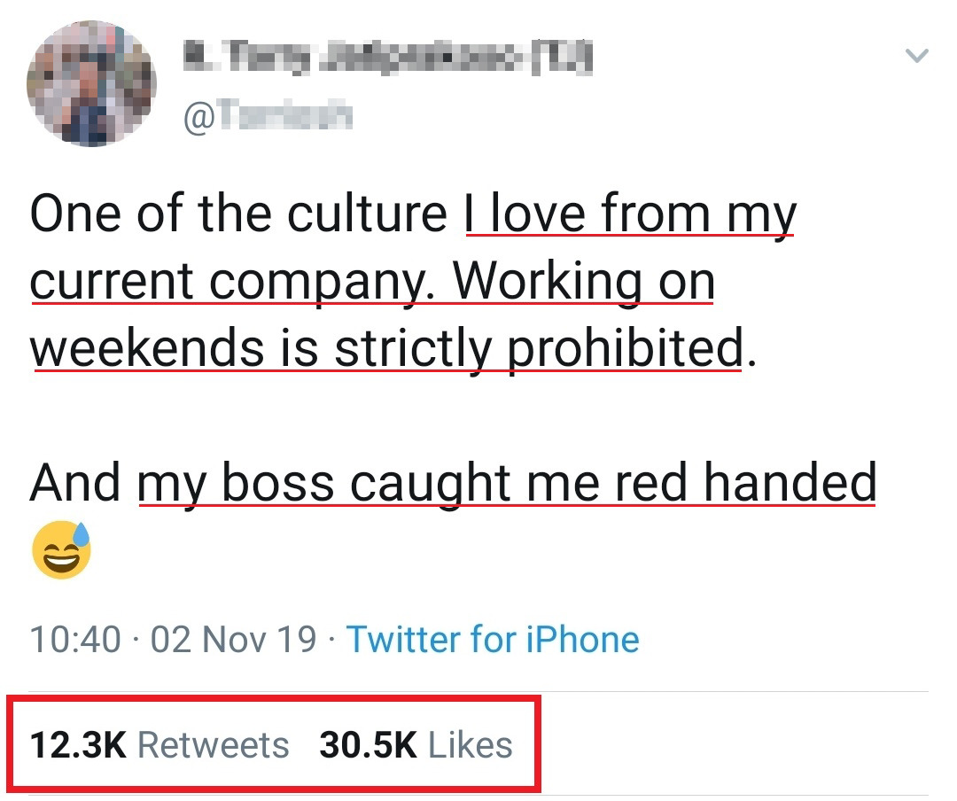 男子在帖文里写道:「我爱我现在的公司,而这是它的文化之一:周末上班是严厉禁止的!老板把我逮个正着!」