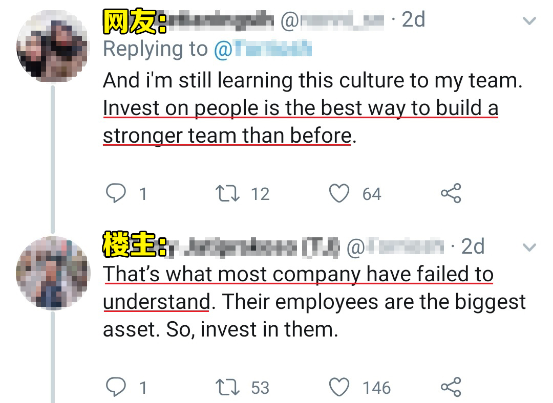 ▼ 「」 网友:「我还在学习把这样的文化带入我的工作团队,投资在员工们身上,才能够让团队更加强大!」