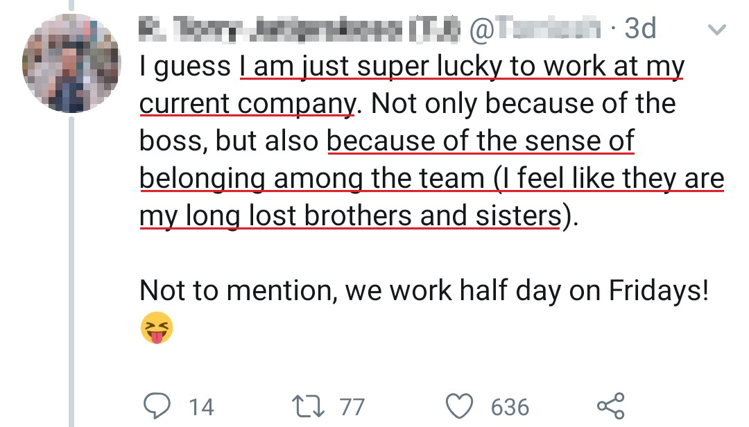 ▼ 原PO留言写道:「我超级幸运能够在现在这家公司上班。不只是老板,这里的同事就像是我的兄弟姐妹一样!」