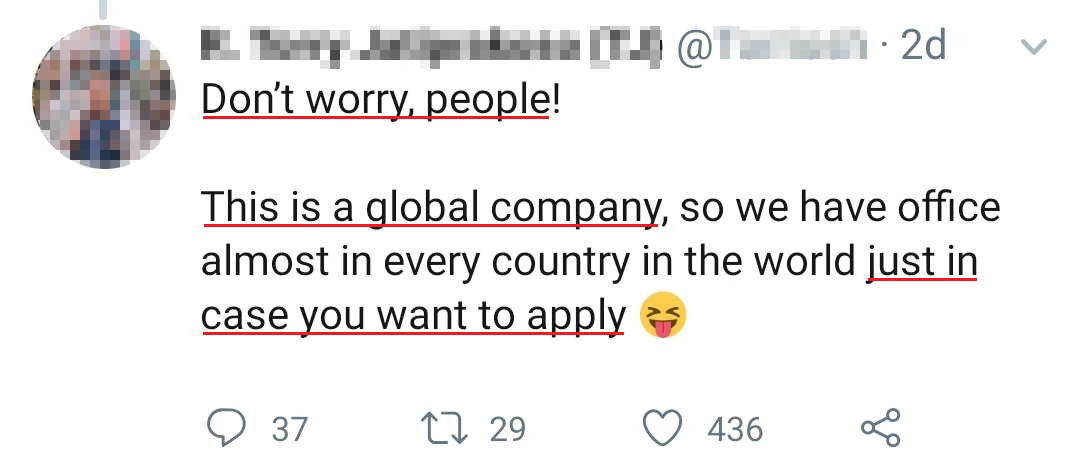 ▼ 原PO还留言回复:「别担心!这是一家国际公司,我们在世界各地都有办公楼!」