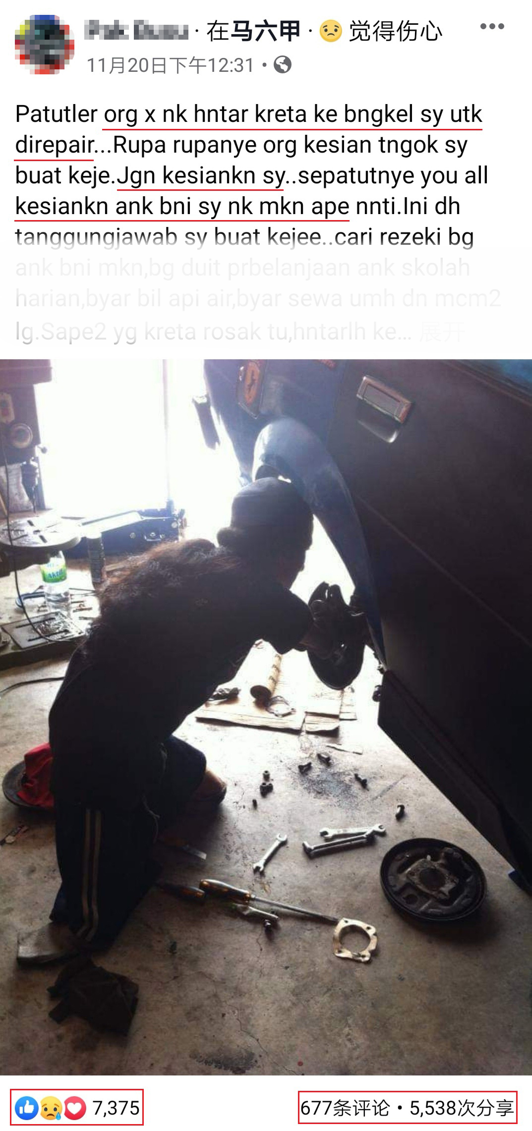 一名来自马六甲的残疾人士,大家称他为Pak Busu。他在面子书上发出帖文写道「不要因为我身上的残疾而可怜我!如果没有人原意送车让我维修,那我拿什么东西来养我的孩子和妻子」!
