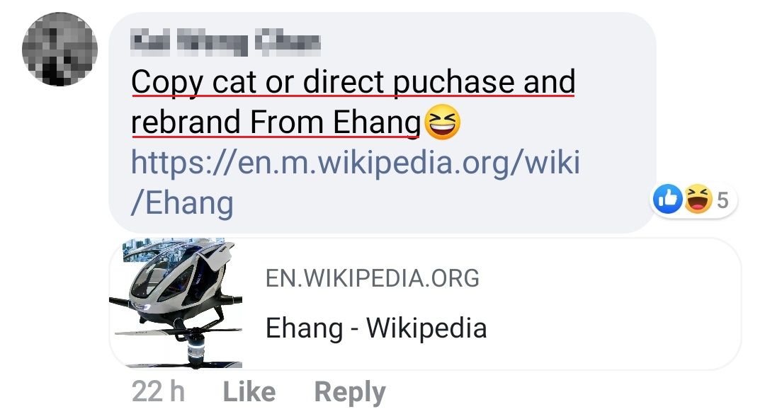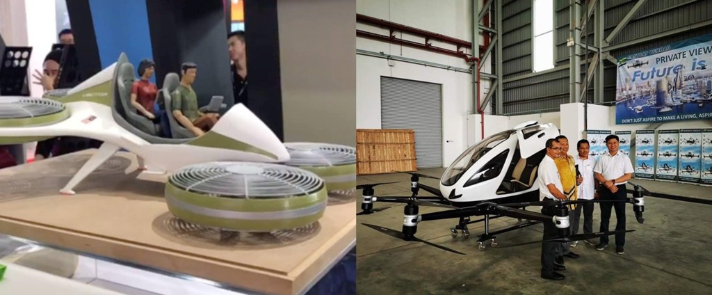 从飞行车的实照中,网友们发现大马的飞行车竟然和一家名为 Eastcap 的公司所展示的“EHANG 216”款飞行器非常相似!