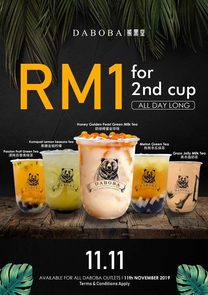 各位奶茶控们,注意啦!大马熊黑堂(Daboba)将在11月11日推出大优惠,第2杯饮料只需RM1!