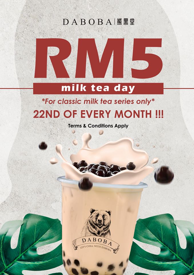 爱喝奶茶的朋友们,注意啦!有好消息要告诉你们!大马熊黑堂(Daboba)将在每一个月推出特别优惠,奶茶只需RM5!