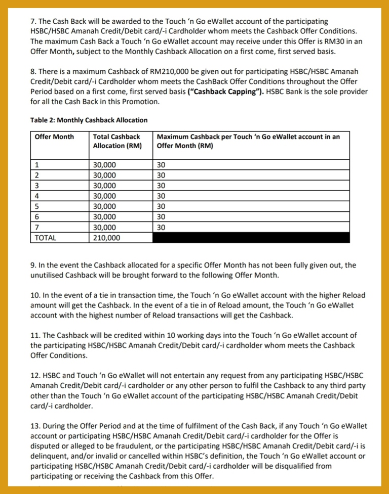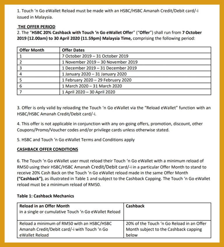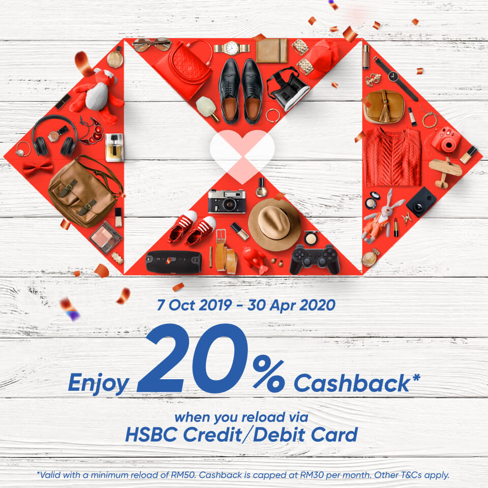 - 透过 HSBC 信用卡或储蓄卡充值RM50或以上,即可获得 20% 现金回扣。