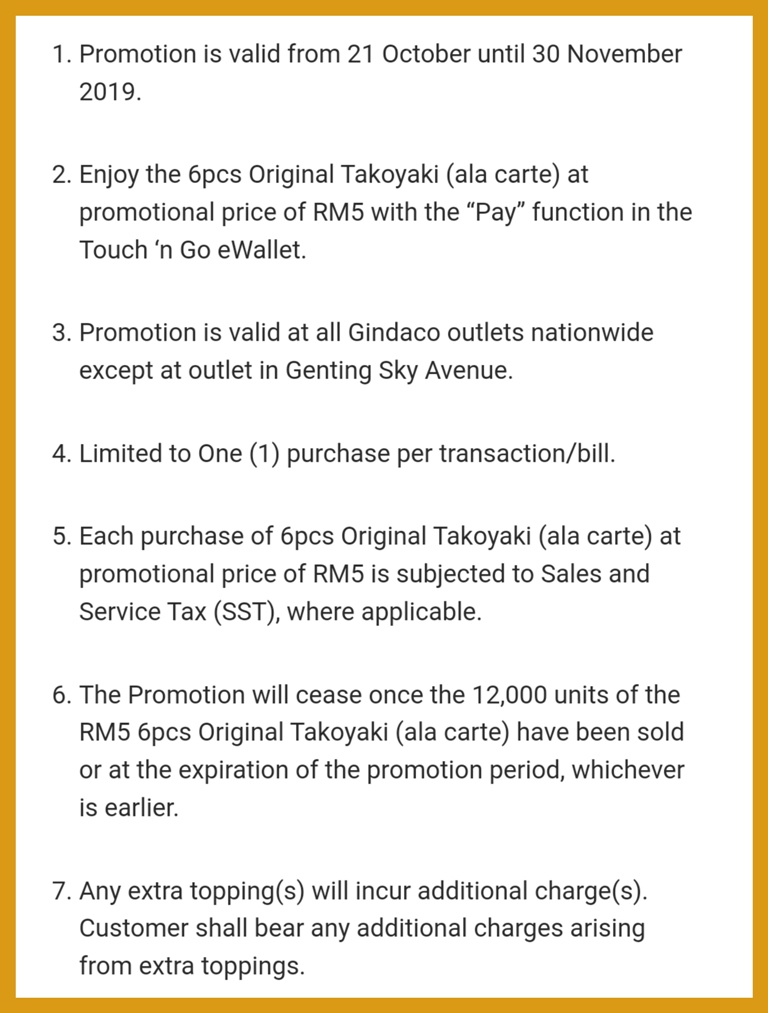 促销地点:全马 Gindaco 分行(除了 Genting Sky Avenue)