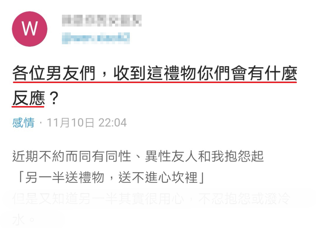 近日,一名女网友就在网上寻求大家的看法!因为她发现身边的朋友及异性友人纷纷抱怨“另一伴送的礼物送不进心坎里”!所以她想知道大家对她即将送出的礼物的看法!