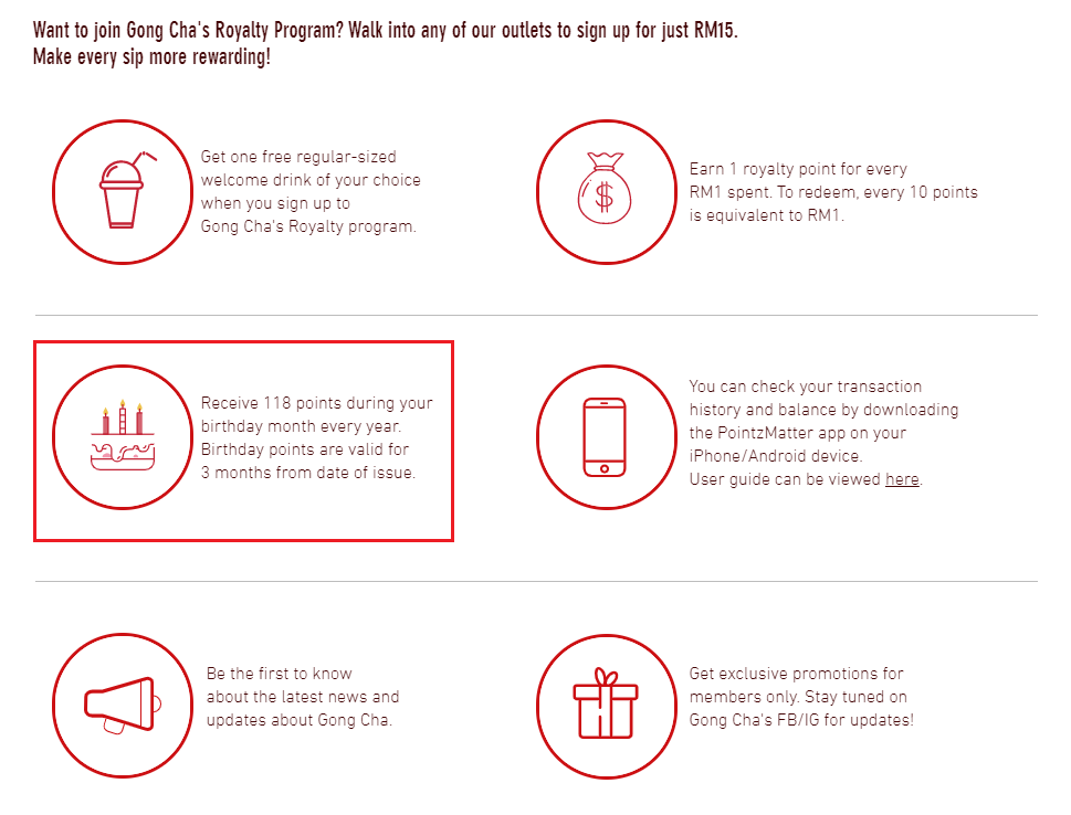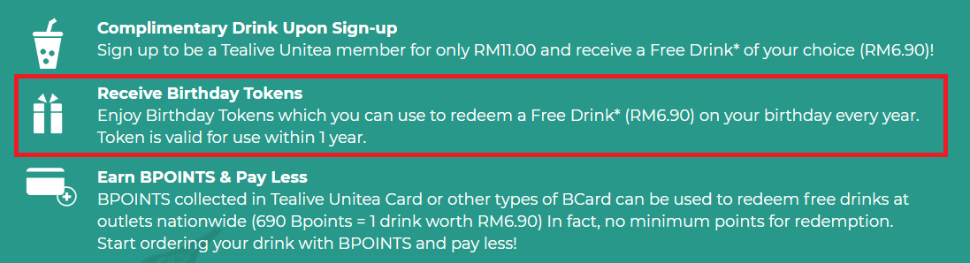 - 获得的生日代币只可用来免费领取一杯价值RM6.50的饮料。