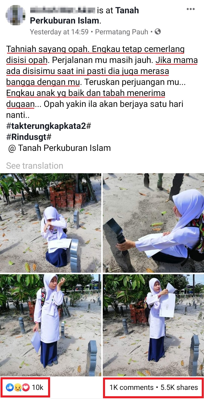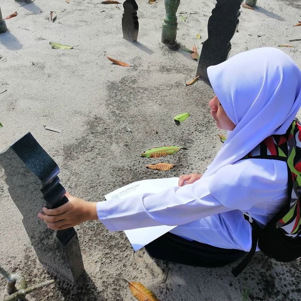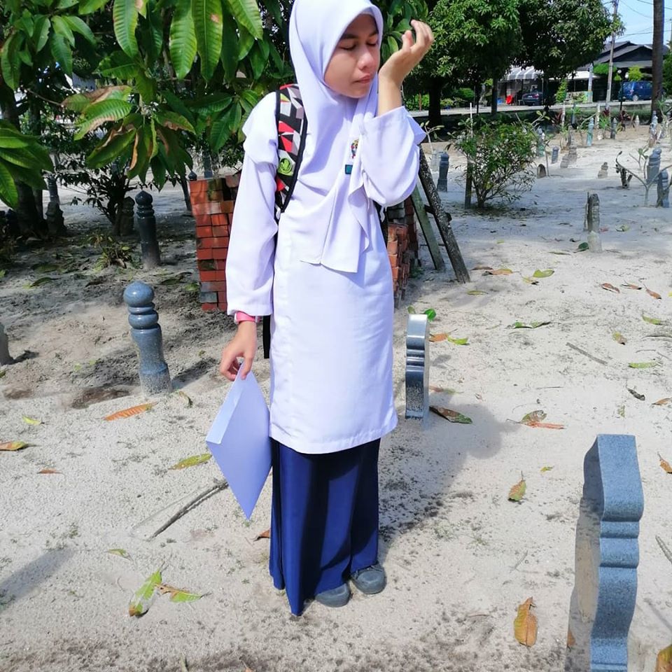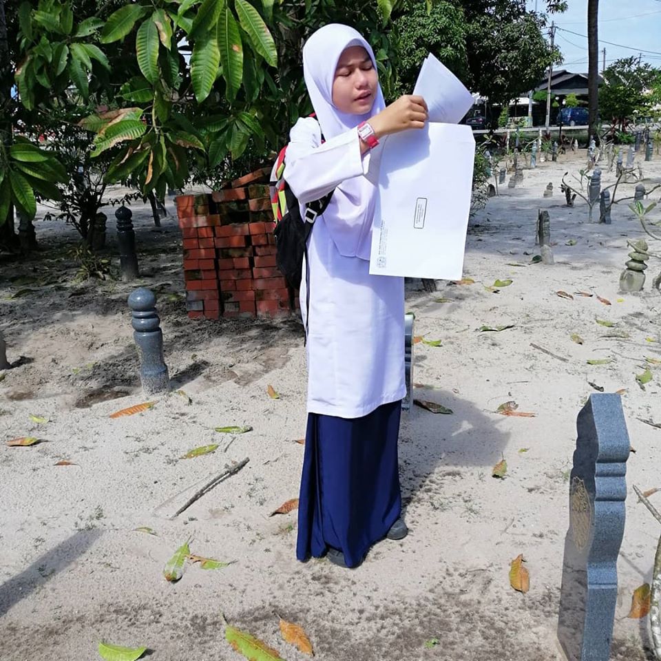 昨天(11月21日),这位六年级的女孩到学校领取 UPSR 考试成绩后,因为想要和过世的妈妈分享喜悦,所以就在外婆的陪同下到了穆斯林坟场。