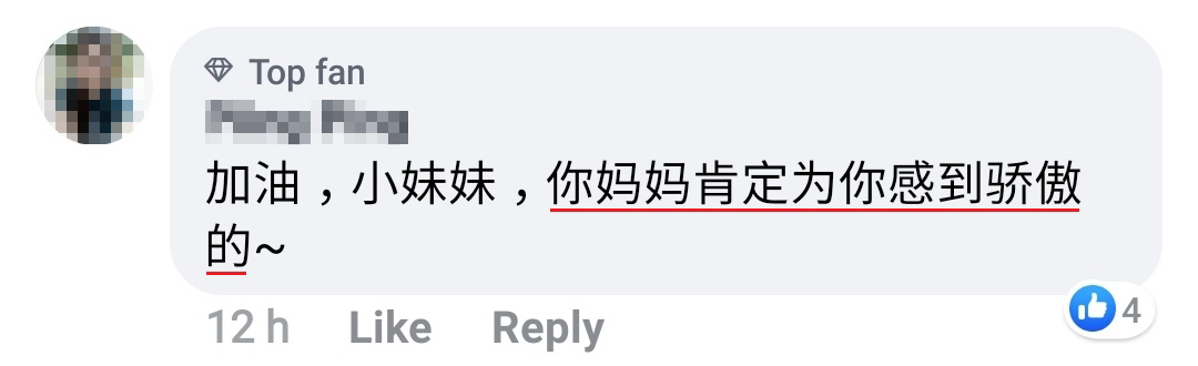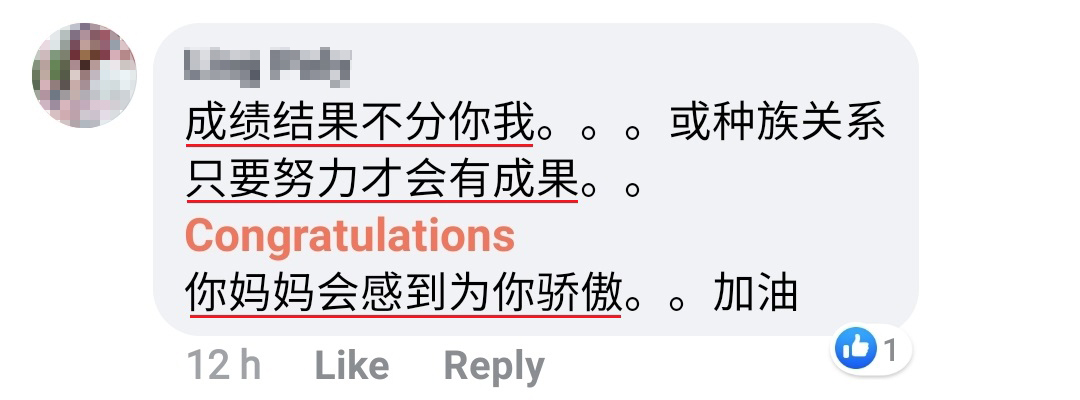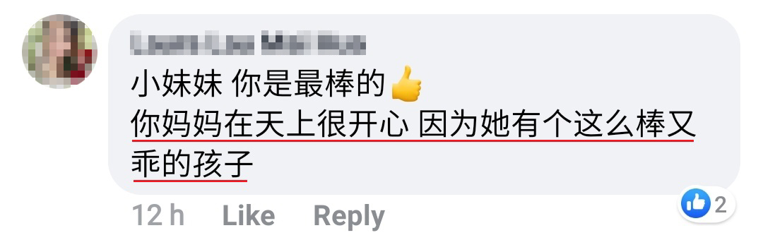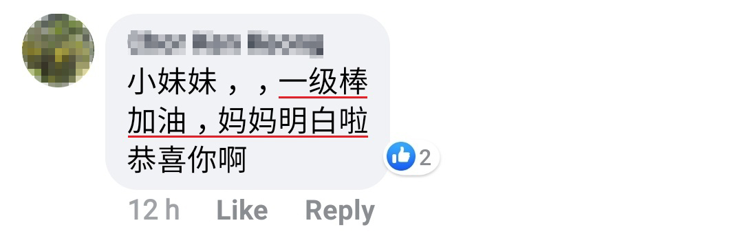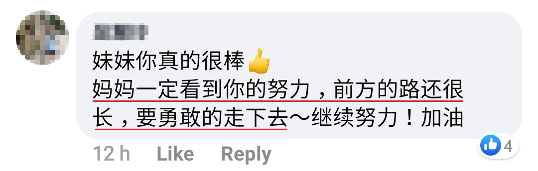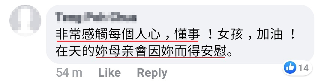 女孩的外婆在面子书 PO文写道:「恭喜妳,外婆的宝贝!在外婆的身边,妳依然很优秀!妳要走的路还很遥远,不管妈妈有没有在妳的身边,这一刻她都因妳而感到骄傲!妳是一个乖巧又坚强的孩子,继续努力!外婆相信妳终有一天会成功的!」