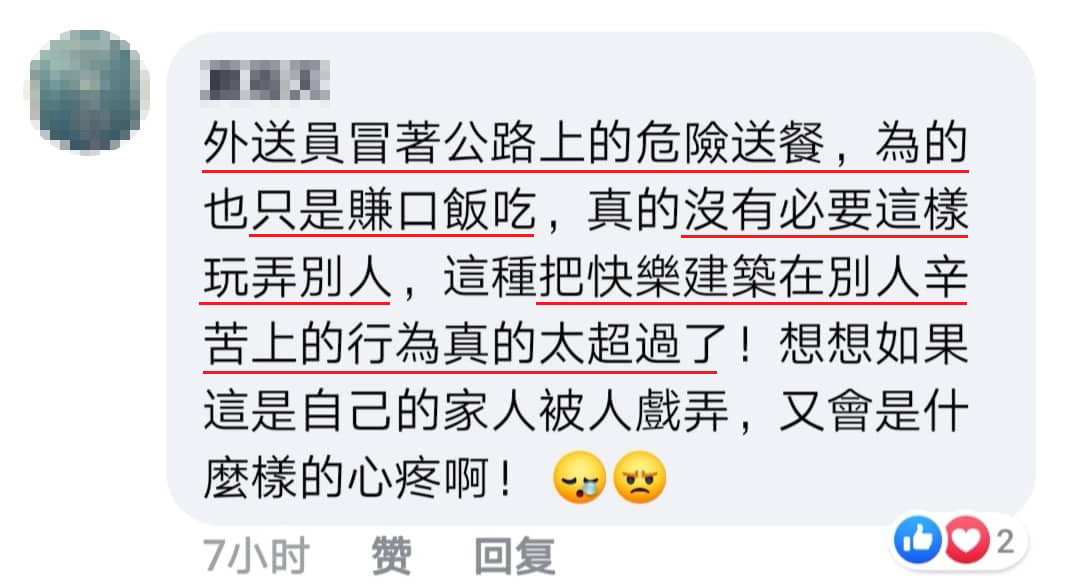 ▼ 而且外送员都是冒着生命的危险在路上送餐,为了就是赚口饭吃,没必要这样玩弄人!