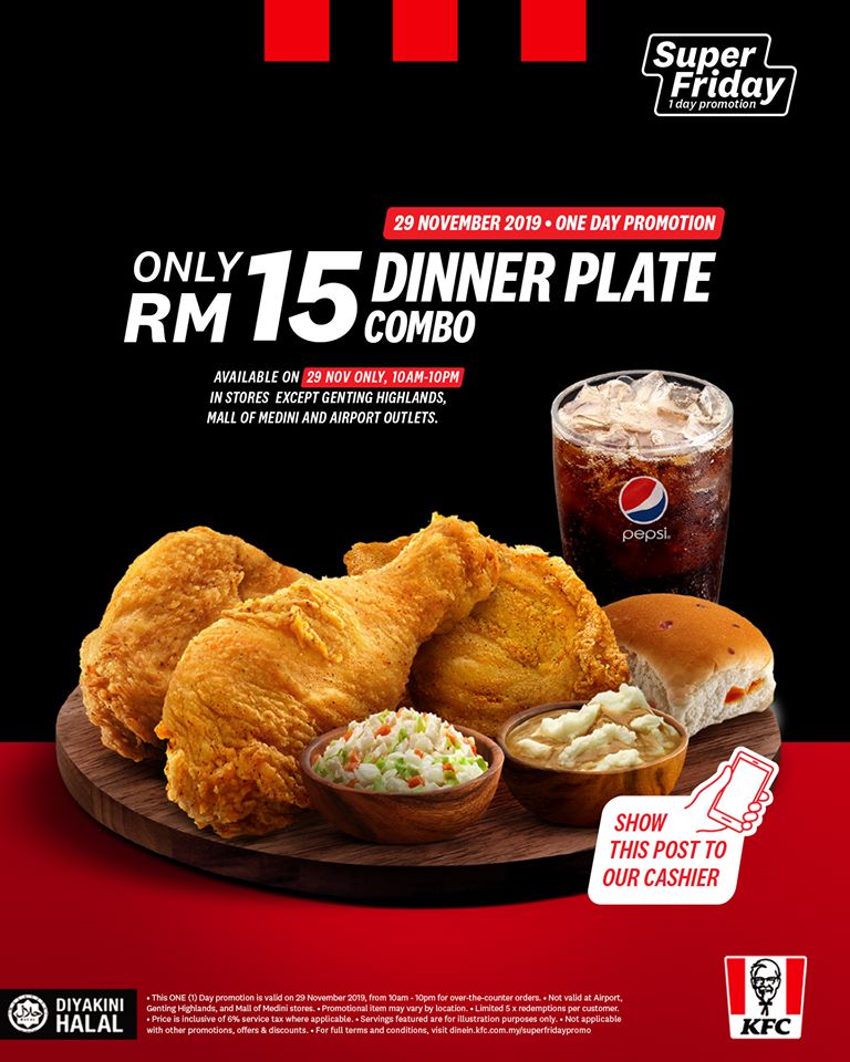 只需向工作人员出示以上的促销照片,就能以RM15购买到平时售价RM19.60的KFC Dinner Plate啦!