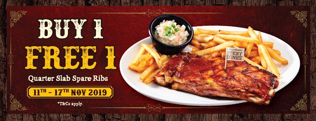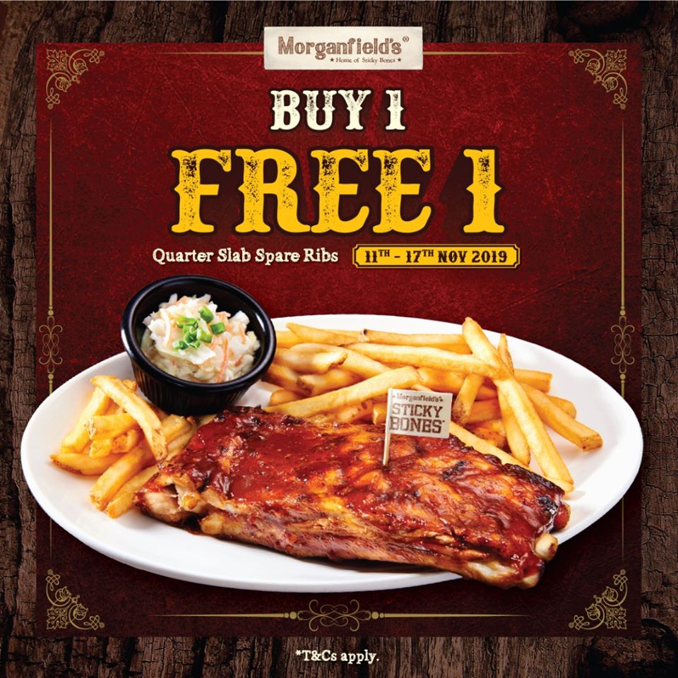 大马 Morganfield’s 从11月11日起,举办长达一个星期的双十一大优惠,他们的招牌 —— 猪肋排(Quarter Slab Sticky Bones Spare Ribs)买一送一!