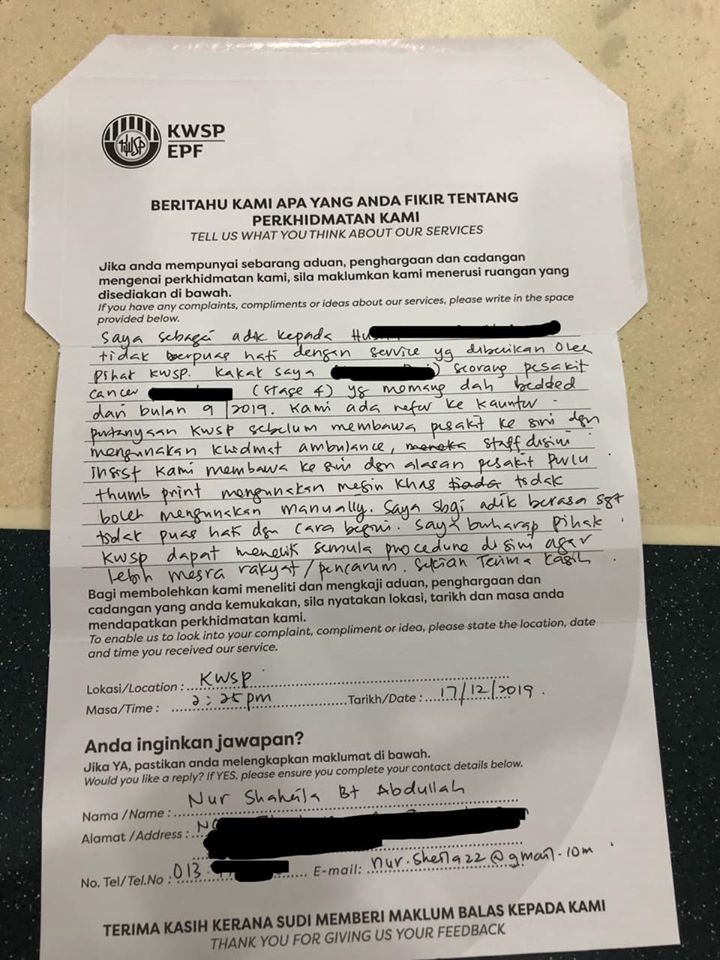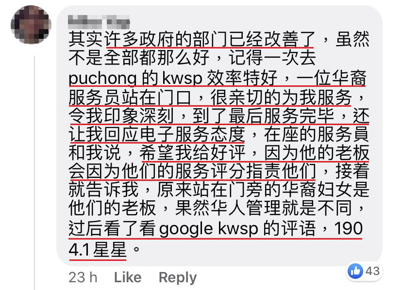我给予公积金局的评语:希望当局能够好好检讨平时的作业程序,我们活在一个先进的国家,改变我们的想法吧!请你们在这件事上尽一些责任!