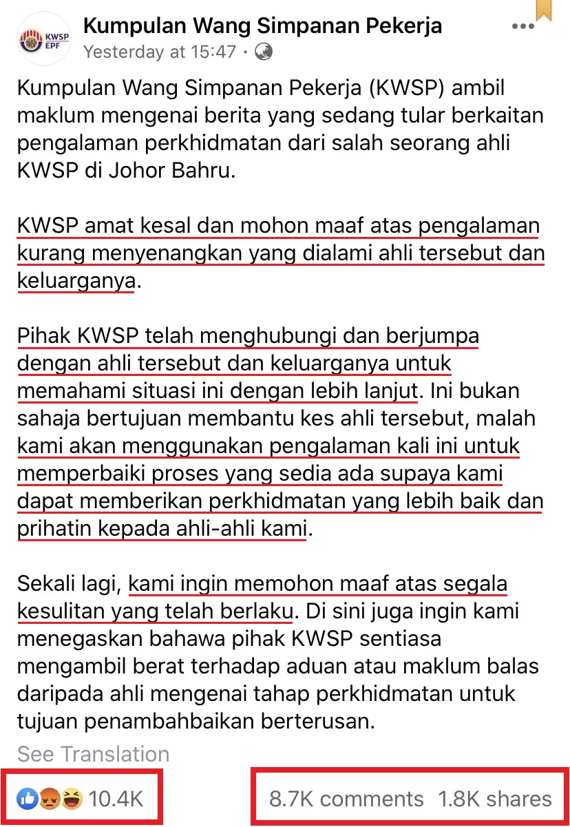 ▼ 于是就在隔天,公积金局通过官方面子书发文,向受害者和受害者的家属道歉。